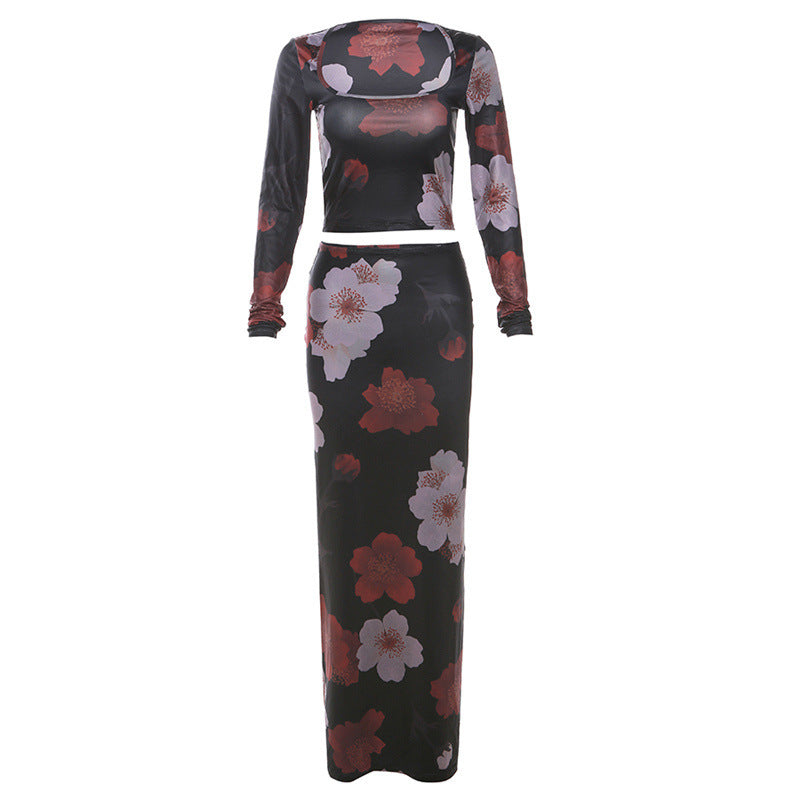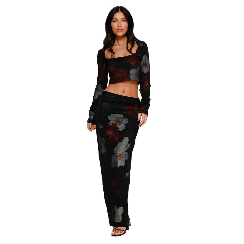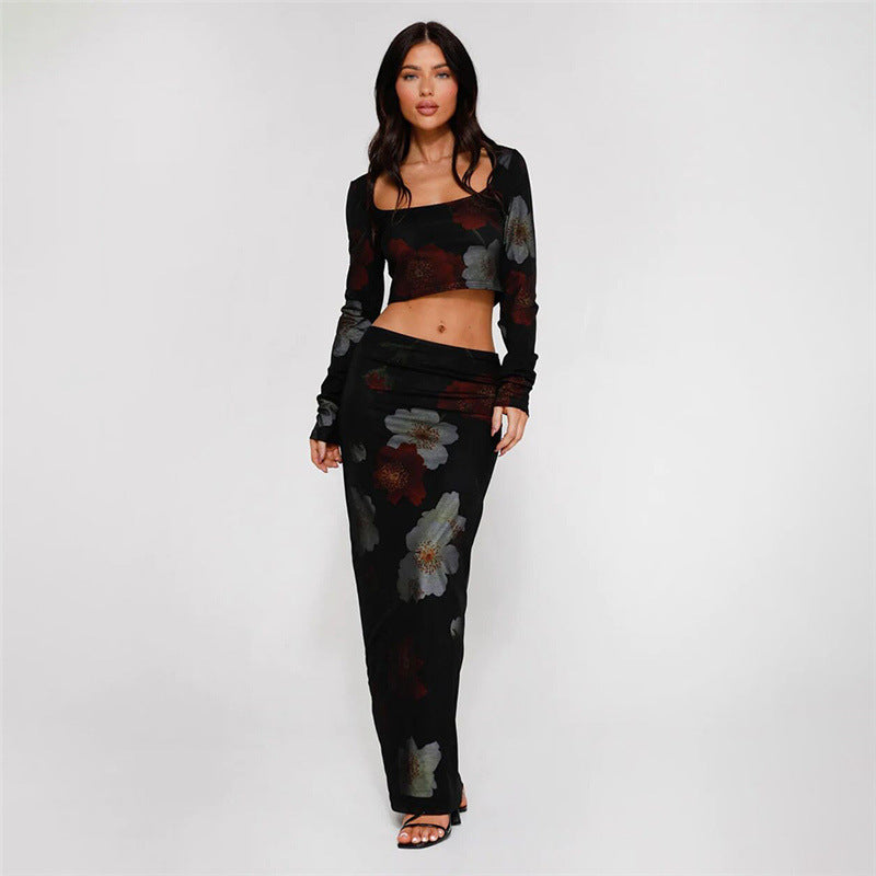 Women's Fashion Printed Square Collar Long Sleeve High Waist Skirt Suit